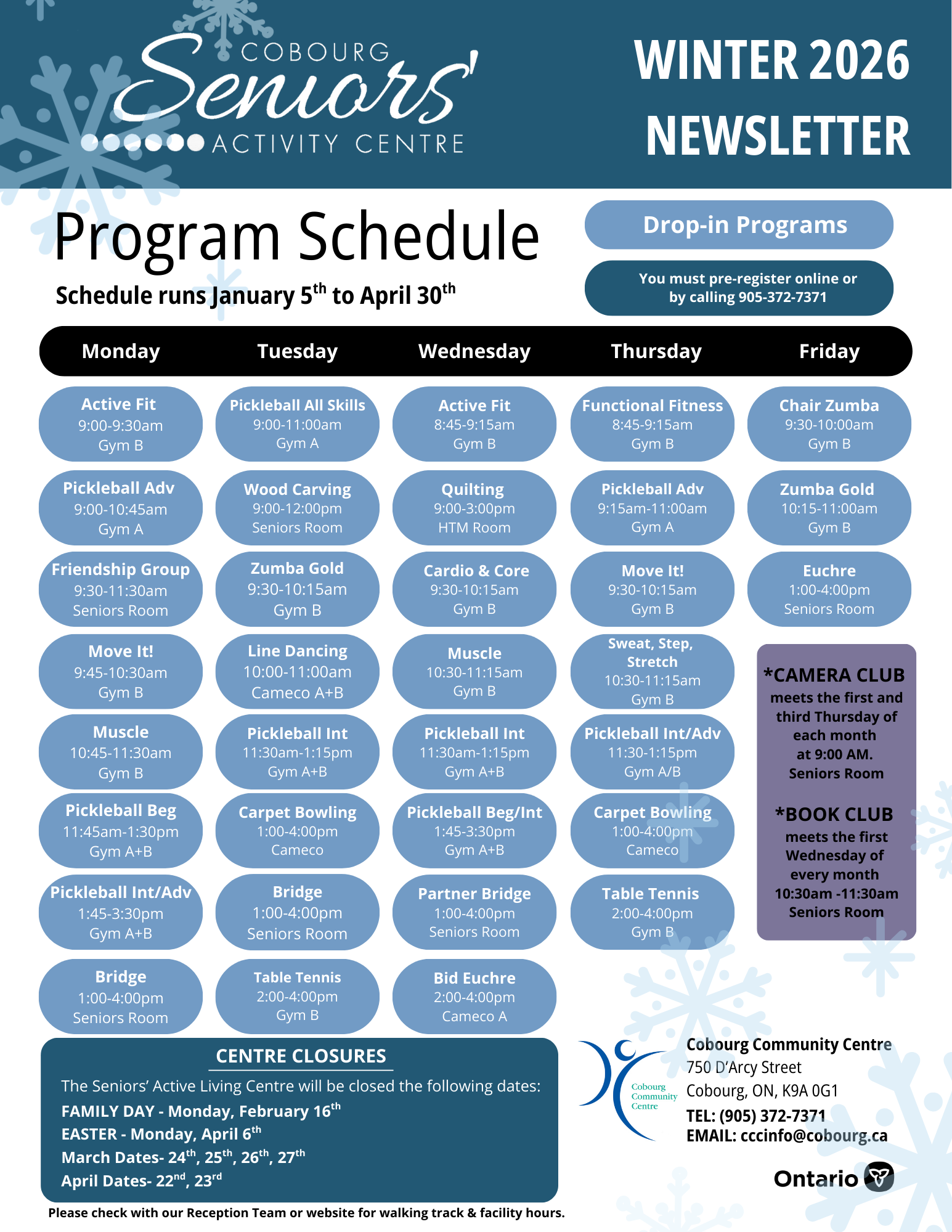 Any pickleball spots that were not filled during Thursday's registration will be made available for enrollment Friday mornings at 11am. If you have already registered for the next week, but would like to play more, this would be the time to sign up! - Registration for all other drop-in programs (fitness, social & table tennis) open Friday mornings at 8:30am for the following week.
